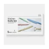 - Includes: Chef knife, bread knife, utility knife, paring knife, peeler