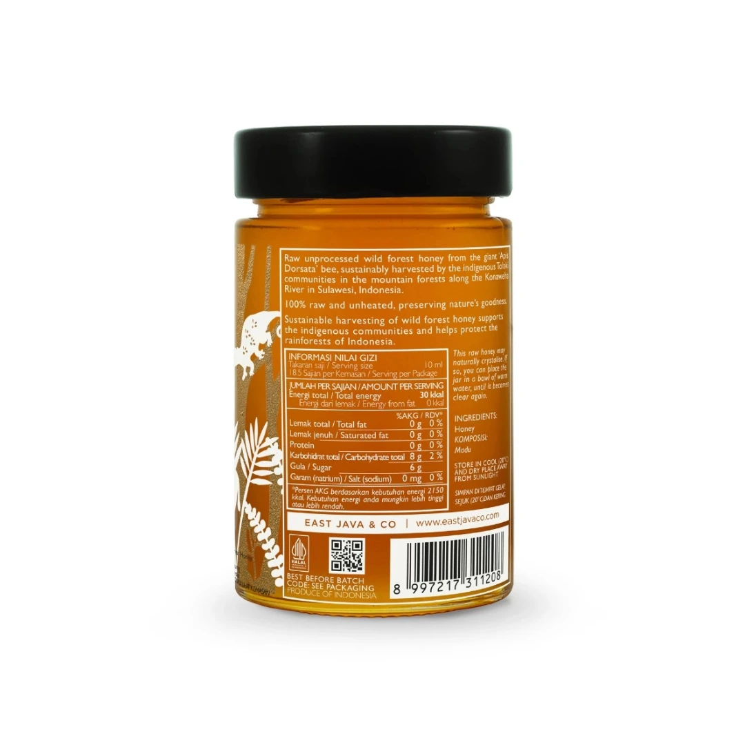 Sulawesi Raw Forest Honey 250g is a premium wild honey collected from the untouched forests of Sulawesi, Indonesia. Carefully harvested from wild Apis dorsata bees, this honey is completely raw and unprocessed—meaning it is never heated or refined, preserving its natural enzymes, pollen, and powerful antioxidants.